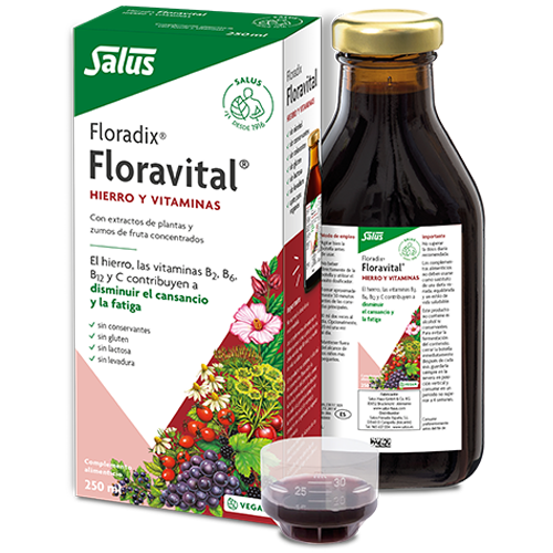 Floradix contiene hierro, vitaminas B2, B6, B12 y C que contribuyen a disminuir el cansancio y la fatiga y al metabolismo energético normal.