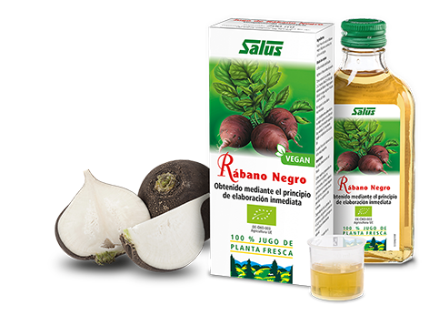 Jugo fresco de raíz de rábano negro (Raphanus sativus) de cultivo ecológico certificado.