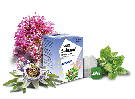 La infusión Salusan está elaborada a base de valeriana, melisa y pasiflora que contribuyen a la relajación y ayudan a mantener un sueño natural. Además contiene menta, manzanilla, regaliz, anís y escaramujo.